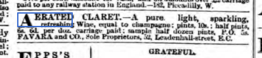 Neither did Sparkling Medoc, the next entry in the lists. ‘Aerated Claret’ was first launched with the aid of adverts in The Times in 1896 and re-launched by the firm of Nathaniel Johnston of Bordeaux in 1902 when the English trade press commented that it was ‘quite worth the trouble of tasting’ being a white wine which ‘to outward appearance resembles Champagne’.